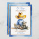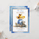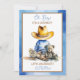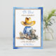 Convites de chá de bebê azul e castanho com um pequeno bebê em um chapéu de vaqueiro sentado com um ursinho de pelúcia, trem e pintinho de bebê. O chá de fraldas do rapaz temático country e ocidental.