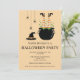 A ilustração divertida do Halloween de Destei das pernas de bruxa listradas laranja e branca que estão a sair de um caldeirão preto cheio de uma bruxa verde borbulhante. Ao lado do caldeirão há um chapéu de bruxa e algumas aranhas penduradas. A cor de fundo é laranja claro e há três áreas de texto personalizáveis perfeitas para os detalhes do evento. Do outro lado há um chapéu de bruxa e mais algumas aranhas.
