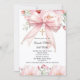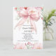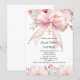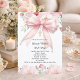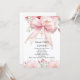 Um fundo branco, decorado com um grande laço rosa com pérolas e, uma cruz dourada e flores rosa. Personalize e adicione um nome e detalhes detalhes.