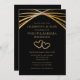 Convide amigos e familiares para uma bela festa de 50 anos de casamento com tema dourado. Personalize este convite de aniversário elegante e único com os nomes do casal, endereço do evento, horário e data da festa e mais texto editável conforme necessário. Eu criei este design original moderno de arco arredondado em tons dourados sobre um fundo preto para você. Não é folha de ouro. A tipografia contemporânea simples em tom dourado pode ser editada. Os dois corações entrelaçados dão um toque romântico. O texto simples e elegante que diz "celebrando 50 anos" pode ser editado para qualquer número para um aniversário de 25 anos ou outro ano de aniversário, se necessário.