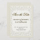 Um elegante e sofisticado e personalizado moderno convite para o casamento "Salve as Datas". Desenvolvido com uma estrutura de rendas brancas sobre fundo bege e texto preto com sombras marrons-claras, para enfatizar a elegância, a gala e a sofisticação da cerimônia, do casal e de suas famílias. O texto pode ser modificado de acordo com as suas necessidades.