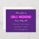 As palavras FIM DE SEMANA DAS MENINAS definidas em neon brilhante e cinco linhas de texto personalizável destacam este cartão postal de convite roxo.