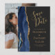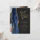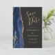 Este elegante e moderno salve a placa de data apresenta um marinho azul de aquarela agata borda cortada com falso brilho dourado. O texto dourado aparece sobre um fundo de cinza de carvão escuro. Substitua facilmente a imagem de amostra no verso por uma foto vertical da futura noiva e noiva.
