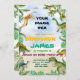 Convide seus convidados para uma festa pré-histórica com este vibrante e divertido convite de aniversário para dinossauros! Apresentando vários dinossauros aquosos e uma luxuosa folhagem da selva, este modelo digital personalizável é perfeito para qualquer celebração de um jovem entusiasta de dinossauros. Personalize facilmente detalhes como idade, data, hora e local para criar um convite exclusivo e memorável que fará com que todos brinquem com o entusiasmo. Este design capta a emoção da era Jurássica e estabelece o palco para uma verdadeira festa de aniversário selvagem!