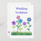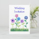 Um Convite de Casamento moderno, chic, da Noiva e do Groom, com uma fileira de flores cor-de-rosa, azuis e mauve, da gama de colagens de papel pintadas à mão pelo 'Flor Power', de Judy Adamson. Totalmente e facilmente personalizável.
