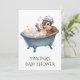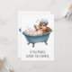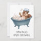 Personalize Retro Squirrel Baby Shower Invitation. The cartoon squirrel, sporting a shower cap, lounged in a retro tub, surrounded by bubbles, pretending to be a celebrity on vacation.