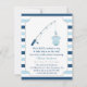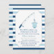 A pesca elegante, contemporânea e moderna tem o tema chá de fraldas em azul marinho, azul pastel e cinzas. Ele tem uma vara de pesca enrolada não em um peixe, mas admiravelmente, um belo casaco de bebê com um simples ícone de peixe. Personalize com os detalhes do seu chá de fraldas.