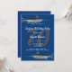 Tema de pesca, convite de aniversário para homem adulto. Imagens de espadarte em cima e em baixo na frente, e varas de pesca nas costas, decoram cartões azuis escuros com texto personalizado de cinza. Sua idade está em cinzas escuras e é parte do fundo. Isto pode ser criado para uma festa surpresa, ou não. Escolha atualizar o papel e receber descontos para ordens em massa.