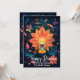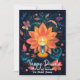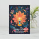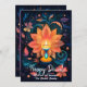 This vertical Diwali greeting card is a celebration of light, color, and joyful blessings. Dominating the scene is a vivid orange lotus with gracefully layered petals, behind which a golden diya flickers softly, its flame glowing with quiet reverence. The flower seems to blossom from a garden of lush, symmetrical flourishes in blues, purples, and bursts of saffron, a harmonious fusion that evokes both tradition and festivity.