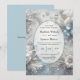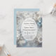 Celebre seu amor pela beleza eterno do inverno neste convite de casamento elegantemente fosco. Apresentando delicadas flores brancas e geladas azuis, imergindo folhas prateadas, penas macios, flocos de neve e faíscas sutis, este design encantador evoca a magia de uma terra maravilhosa de neve. Perfeito para casamentos no inverno, cerimônias de férias, ou qualquer evento romântico colocado em um cenário gelado. O soft gradient center oferece amplo espaço para o seu texto personalizado enquanto a borda do ornamentado cria um quadro luxuoso. Uma escolha incrível para casais sonhando com um conto de fadas de inverno.