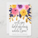 Este convite de casamento elegante apresenta flores em aquarela em tons de rosa, amarelo dourado e roxo, juntamente com folhas em dourado e azul-marinho. Uma tipografia moderna lê: "Você segura meu vestido enquanto eu faço xixi?". Personalize o texto no verso com sua própria mensagem! Ótimo para as damas de honra.