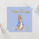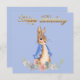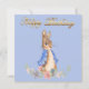 Peter the Rabbit em um Fundo Azul com texto "Feliz aniversário" dourado.