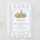 Peter rabbit with a blue jacket blue in vegetable garden baby shower template invitation digital instant download. A cute bunny in a blue jacket standing in a garden with carrots for a baby boy baby shower, vintage retro story book baby shower invitations, retro dusty blue stripes baby shower invitations