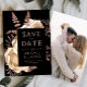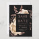 This elegant, moody wedding Save the Date card features a lush, romantic floral bouquet in ivory with rose gold faux foil and glitter foliage on a black background. Customize the rose pink text in stylish fonts on a black rectangle, and add your favorite vertical photo to the back.