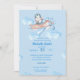 Convite Piloto Pinguim Azul Cóteo de Aquarela com fundo texturado, nuvens azuis. O fundo tem fundo azul com manchas brancas. Mamãe vai adorar esse chá de fraldas de garotos alegres.