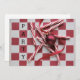 fotografia de palitos de hortelã-pimenta, um ornamento vermelho e uma fita em um quadro de xadrez vermelho e estêndido de cinzas