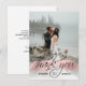 Diga obrigado aos seus convidados com esses belos e exclusivos cartões-postais. Folha de ouro rosa falso com pincelada e agradecimento encantador em caligrafia. Personalize-os adicionando os nomes da noiva e do noivo e a data do casamento ou aniversário com foto / imagem. O verso do cartão tem uma opção de mensagem
