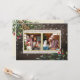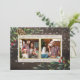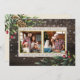 Este cartão com fotos de férias é perfeito para qualquer família. Este design apresenta um lindo fundo de madeira russa escuro com uma delicada camada de floco de neve. Nos cantos superior esquerdo e inferior direito encontram-se alguns pergaminhos festivos pintados à mão com pínus cones e bagas. No centro do cartão estão 2 fotos quadradas com delicadas bordas de folha de ouro com "desejamos-lhe um Feliz Natal" acima e "com amor", e então seu nome de família, abaixo das fotos.