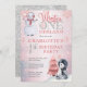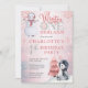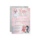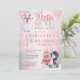 Pinguim de aquarela em um chapéu de santa e boneco de neve com neve caindo ao redor do "Winter ONEderland primeiro aniversario Party". Design está cor-de-rosa, cinza, azul-céu, preto-e-branco. Simplesmente personalize com o nome do seu filho e os detalhes da festa de aniversário. A parte traseira apresenta um fundo brilhante de tonalidade prateada. Composto por Designs Holiday Hearts.