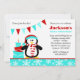 Um convite de aniversário de Maravilha de inverno. Apresentando um pinguim, flocos de neve, bolo de aniversário e banner de bunting. Faz um excelente convidar para uma festa de aniversário de criança ou menina de inverno. Mostrado em azul e vermelho.