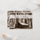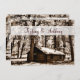 Esta fotografia rústica do país no tom do sepia caracteriza a cabana rústica de madeira de um caçador velho nas madeiras que sentam-se abaixo dos pinheiros altos com um alce no fundo. A foto tem um efeito colorido sepia dar-lhe um olhar rústico. Um lado do convite rústico do casamento do país tem os nomes dos noivos através de uma listra transparente perto da parte superior. O outro lado do convite rústico do casamento tem a mesma cena rústica da cabana rústica de madeira entre os pinheiros com os detalhes do convite do casamento.