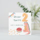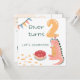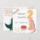 Convite de piniata de aniversário de dinossauro caprichoso idade 2 neutro - Design simples para um convite de festa de dinossauro super fofo. Personalize o texto com suas informações e o nome do seu pequeno. Diferentes desenhos na frente e no verso com dois dinossauros diferentes, um bolo, uma piniata, um balão e um fundo de vulcão para qualquer amante de dinossauros, qualquer gênero.