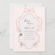 Beautiful pink watercolor ribbon frame surrounding lovely fonts and scripts done in coordinating colors baby shower invite. Ballerina tutu, slippers and other sweet girly whimsical accents coordinated pink pastel background. A perfect baby shower invitation for any season.