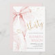 Pink Bow 30th birthday invitation. Modern feminine design in blush pink and gold. Features trendy watercolor coquette bow, and heart script font "thirty". Perfect for an elegant style women's bday celebration. Personalize with your own details. Printed Zazzle invitations or instant download digital printable template.