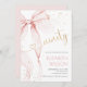 Pink Bow 90th birthday invitation. Modern feminine design in blush pink and gold. Features trendy watercolor coquette bow, and heart script font "ninety". Perfect for an elegant style women's bday celebration. Personalize with your own details. Printed Zazzle invitations or instant download digital printable template.