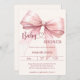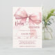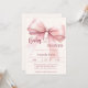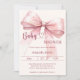 A soft beige, cream background, decorated with a large pink bow. For celebrating a baby girl. Personalize and add a name and party details.