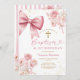 Elegant Pink Bow Coquette Girl Baptism & 1st Birthday Gold Glitter Pink Floral Invitation