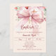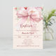 A soft cream, peach colored background, decorated with a pink large bow and, a golden cross and pink flowers. Personalize and add a name and details details.
