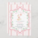 Our elegant "Pink Bow One Silly Goose Floral Girl 1st Birthday invitation" features a watercolor illustration of a white goose wearing a party hat and adorned with a pink bow, holding a pink balloon. The goose is framed by a decorative pink ribbon embellished with green floral motifs. The background is striped in white and pink.