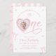 A sweet and elegant first birthday invitation featuring a delicate pink bow theme and a charming heart photo frame.