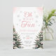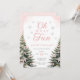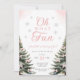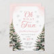 "Oh What Fun" Pink Bow Winter Onerderland Girl 1st Birthday Invitation with pine trees and pink bow details.