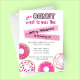 This adorable pink donut birthday invitation features a fun, modern design perfect for little kids’ celebrations. The layout showcases charming illustrated donuts with bright pink frosting, sprinkles, and soft pastel tones, creating a sweet and cheerful aesthetic. Playful mixed typography combines bold donut-patterned lettering with handwritten-style script for a lively, whimsical look. Layered pink text bars add a trendy, contemporary touch, making the birthday details stand out beautifully. Ideal for donut-themed parties, bakery celebrations, or any fun and colorful birthday event.