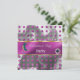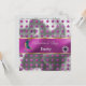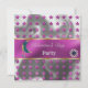 Um convite elegante em rosa fúcsia e folha de prata apresentando uma Lua azul com um charme de pérola dourada safira, colares de corações dourados azuis teal e estrelas rosa fúcsia brilhantes.