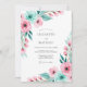 This design features a romantic watercolor palette of soft blush pink and vibrant teal. Delicate pink roses and smaller blossoms are paired with lush mint green and teal foliage to create a fresh, airy feel. The artistic botanical elements are arranged in a cascading style that evokes the beauty of a blooming meadow. Perfect for couples seeking a sophisticated and colorful aesthetic for their seasonal nuptials.