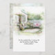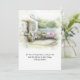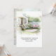 A dreamy watercolor garden scene unfolds beside a charming cottage, surrounded by lush greenery and soft pink blossoms takes center stage on this birthday card. A white picket fence frames a peaceful patio where delicate wrought-iron seating is dressed in rosy cushions, inviting quiet moments of joy and reflection. Sunlight filters through flowering trees, casting a warm, gentle glow across the stone path, while a bird glides gracefully overhead. The scene feels serene, hopeful, and full of gentle beauty—perfect for celebrating a birthday filled with peace, happiness, and sweet new beginnings. Personalize the front with recipients name and add a special message - the back gets another special message.