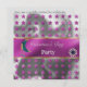 Um convite elegante em rosa fúcsia e folha de prata apresentando uma Lua azul com um encanto de pérola safira dourada, colares de corações azuis esverdeados dourados e estrelas rosa fúcsia brilhantes.