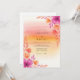 This design features a vibrant watercolor wash background reminiscent of a warm sunset, transitioning from soft peach to bright yellow. Delicate magenta hibiscus and orange blossoms adorn the edges, accented by slender painterly leaves. The artistic style creates a romantic and warm atmosphere perfect for a seasonal destination event.