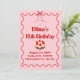 This pink and red cute birthday invitation highlights a strawberry-topped cupcake, wavy red border, pink bow, and star on a soft pink background
