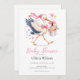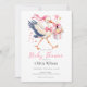 A baby was delivered by a cute stork wearing a pink hat and bow. Pink hearts were surrounded by a baby and stork.