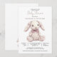 A pink toile bunny rabbit baby girl baby shower invitation featuring a sweet floral patterned stuffed bunny illustration and soft dusty rose typography. The gentle toile pattern gives the bunny a delicate nursery inspired look while the clean white background keeps the design elegant and modern. Centered artwork creates a charming focal point that feels warm, soft, and welcoming for a baby girl celebration. Perfect for a bunny themed baby shower, rabbit themed baby shower, or classic nursery inspired gathering. The simple layout keeps the event details easy to read while allowing the illustrated bunny to remain the heart of the design. Available in print, as a digital download or both.