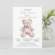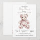 A pink toile teddy bear baby girl baby shower invitation featuring a charming floral patterned teddy illustration and soft dusty rose typography. The toile style bear adds a sweet nursery inspired detail while the clean white background keeps the design light and elegant. The teddy bear illustration sits at the center of the layout, creating a warm and welcoming focal point for a baby girl celebration. A lovely choice for a teddy bear themed baby shower, baby girl shower, or classic nursery inspired gathering. The simple layout keeps the event details easy to read while allowing the artwork to remain the highlight of the invitation. Available in print, as a digital download or both.
