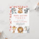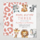 Cute and fun girl's safari animals theme 3rd birthday party invitation featuring illustration of safari animals of giraffe, snow leopard, rhino, lion, elephant, and zebra with pink flowers, crowns, and party hats. The text says "young, wild and three."