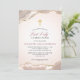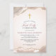 Este elegante primeiro convite da comunhão apresenta um belo agato cor-de-rosa e um brilho de ouro falso. Este convite cor-de-rosa é acentuado com uma pequena cruz dourada e um elegante texto de guião dourado rosa e é perfeito para a primeira comunhão sagrada de uma menina.