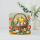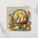 Pintinhos de Páscoas bonitas e antiquadas estão sentados em uma cesta cheia de ovo com tulipas vibrantes ao redor. Personalize o outro lado deste convite com os detalhes do seu partido.