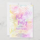 Faça um salto com a nossa folha de palmeiras tropicais legal, convites para 16 anos! Apresentando ilustrações das folhas brancas editáveis sobre o tema do unicórnio da lavagem a aquarela do arco-íris com uma divertida fonte e corações modernos de pincel. . Perfeito para uma festa de aniversário Doce 16 ou qualquer lugar de verão.