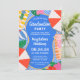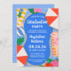 Convite para festas de formatura segundos graus coloridas, modernas e modernas. Os detalhes da festa estão escritos na água azul da piscina em texto branco. A vista aérea mostra as mulheres que tomam banho de sol, os guarda-chuvas vermelhos e brancos, as bolas de praia, as flores tropicais e as folhas de palma. O azulejo azul e branco fornece o fundo. Este item faz parte da coleção de Partidos de Piscinas de Graduação.
